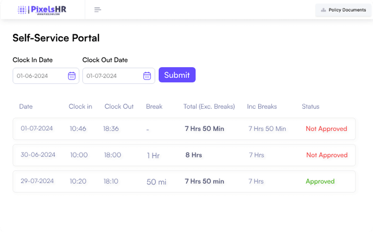 Give your employees control over their time tracking with a self-service portal. They can clock in/out effortlessly, check their time records, and stay engaged with their own time management.
