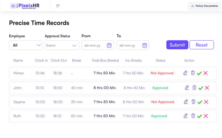 With PixelsHR, time tracking is error-free. Get exact time logs for reliable payroll processing and insightful performance assessments.