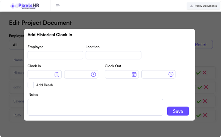 Whether it’s through map location or a quick barcode scan, PixelsHR offers flexible clocking in/out options, making it easy for your team to record their time with precision.