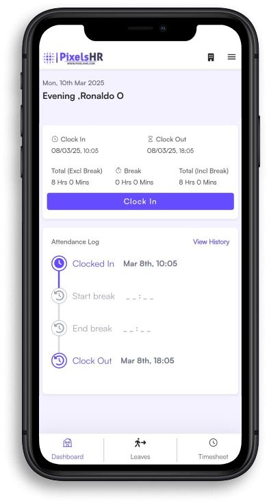 Clocking in made effortless! The PixelsHR App ensures accurate time tracking with: ✅ Manual Clock-In/Out – Log work hours easily via the app. ✅ Auto Clock-In/Out – Automatically clock in within a 200m work radius. ✅ Real-Time Sync – Instantly update attendance records.