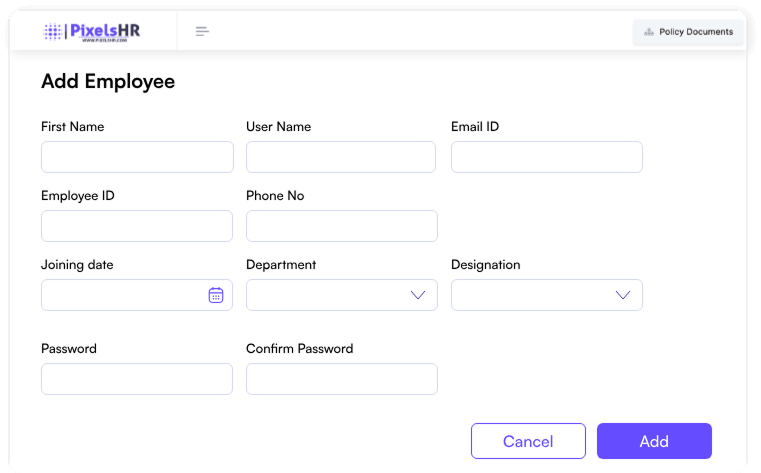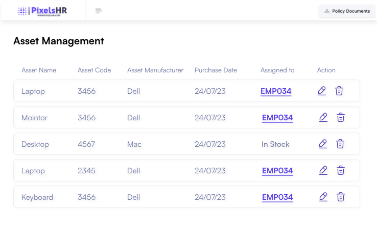 Keep track of company assets allocated to employees and ensure everything is accounted for. Whether you choose to enter details manually or prefer uploading them in bulk, PixelsHR is designed for maximum convenience.