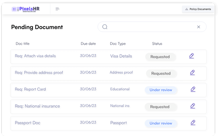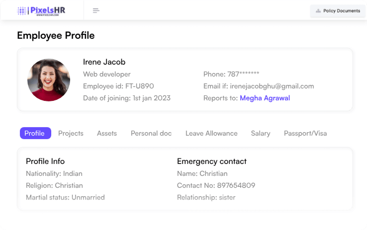 Employees can add all their essential details to their profiles with ease – personal information, passport details, contact information, and more. Uploading necessary documents is also a breeze with our PixelsHR Compliance Management Platform.