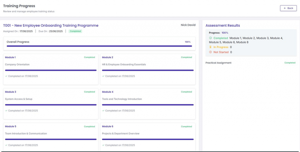 Allocate courses to individuals, teams, or entire departments in a click. Automated reminders keep everyone on schedule, while smart scheduling avoids calendar clashes. HR can view allocations in real time—no more spreadsheet chasing.